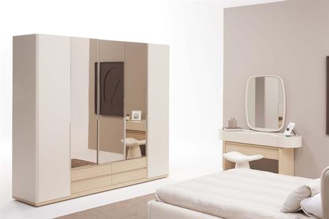 • İÇERİK 1x Karyola+ 1 x 6 Kapaklı Dolap +2x Komodin +1 Aynalı Şifonyer +1 Puf